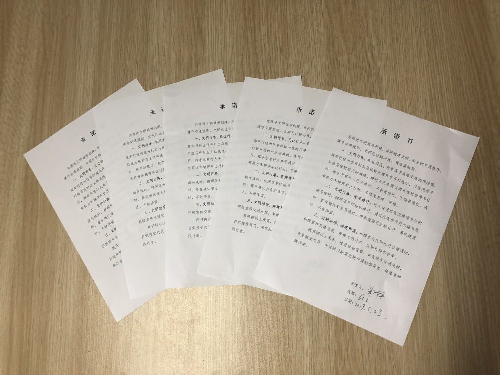 禮讓行人,傳播文明;創(chuàng )建文明,我來(lái)承諾。駕駛員自愿簽訂《禮讓斑馬線(xiàn)承諾書(shū)》,自覺(jué)做到斑馬線(xiàn)前主動(dòng)禮讓?zhuān)浞终故靖咝鹿粏T工的職業(yè)素質(zhì)和文明形象,大家從我做起、從小事做起,共同營(yíng)造更加暢通、有序、文明的城市道路交通環(huán)境。