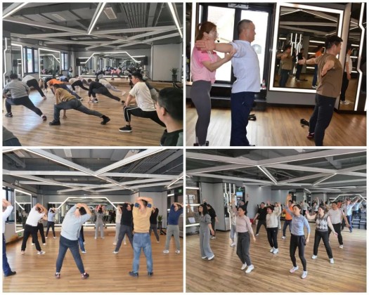 “大家跟著(zhù)我的動(dòng)作,動(dòng)起來(lái)!”團操教練憑借豐富的操課教學(xué)經(jīng)驗和專(zhuān)業(yè)知識,首先細心指導大家學(xué)習了操前熱身技巧、腰椎舒緩動(dòng)作;隨后帶領(lǐng)大家一起做全身燃脂運動(dòng)和無(wú)氧節拍運動(dòng),跳操結束后指導大家做好肩頸拉伸和放松。大家積極投身團操運動(dòng)中,揮灑汗水,體會(huì )運動(dòng)的快樂(lè ),收獲了滿(mǎn)滿(mǎn)能量!