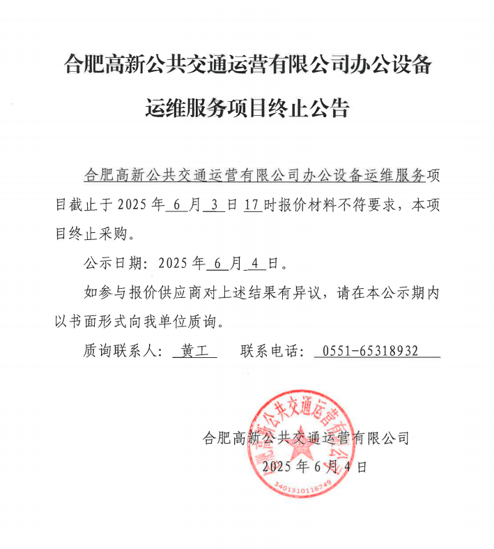 合肥高新公共交通運營(yíng)有限公司辦公設備運維服務(wù)項目終止公告