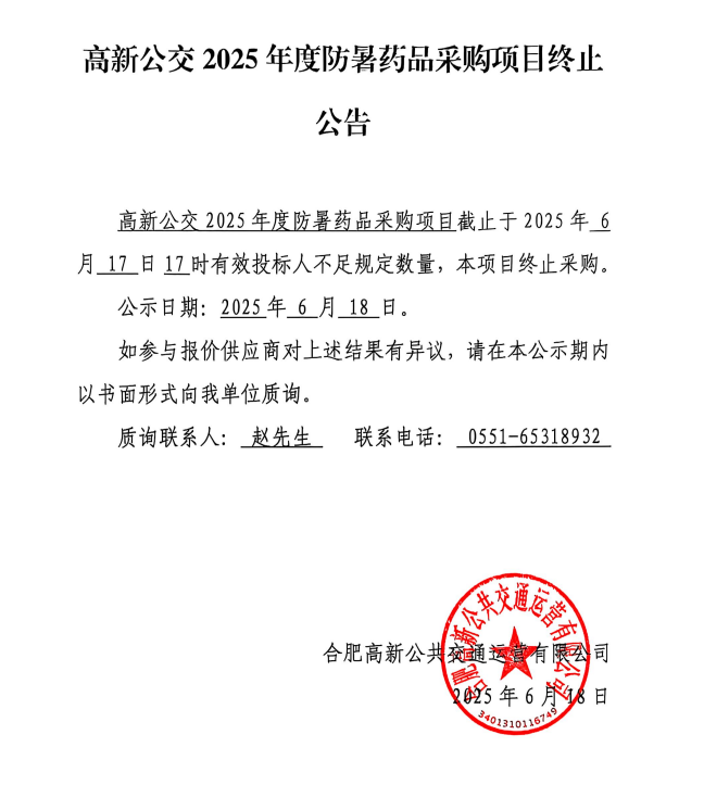 高新公交2025年度防暑藥品項目終止公告