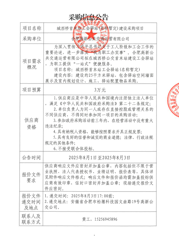 城西橋首末站工會(huì )驛站(名稱(chēng)暫定)建設采購項目采購信息公告
